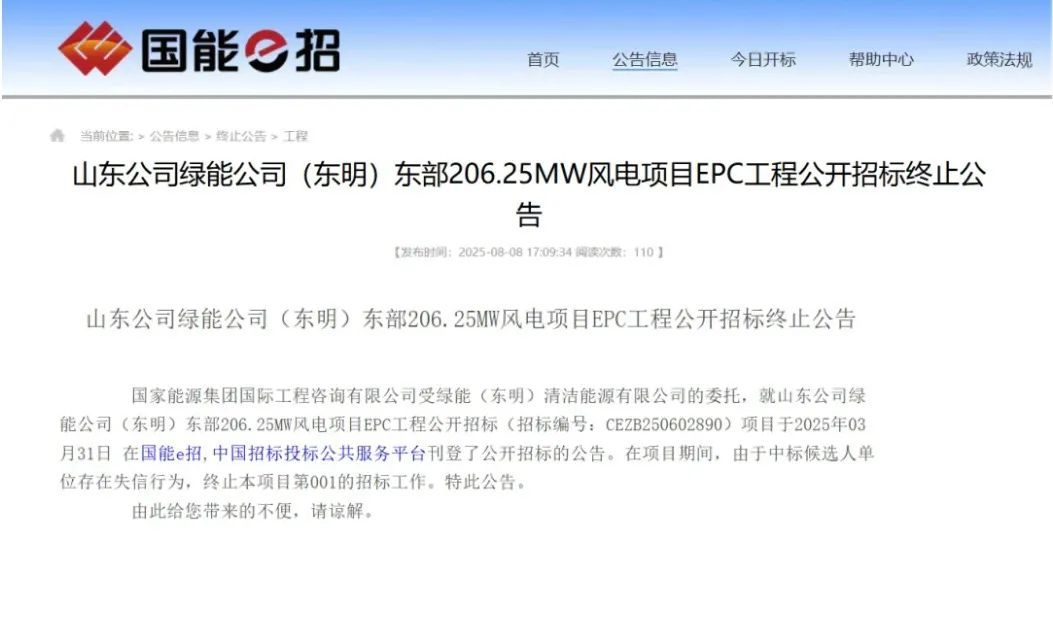 8月8日,国家能源集团发布山东公司绿能公司(东明)东部206.25MW风电项目EPC工程公开招标终止公告。公告显示,在项目期间,由于中标候选人单位存在失信行为,终止本项目第001的招标工作。